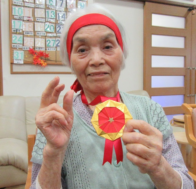 ひとしきり競技を終えられた後は職員手作りの金メダルをかけられて満足そうなお顔を見せてくださいました!