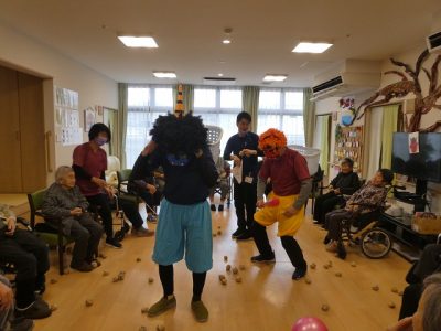 皆様の前に鬼さんが登場し「鬼は外、福は内」と新聞の球を豆にして鬼さんに必死でぶつけられていました。