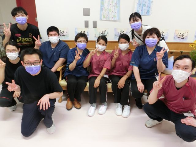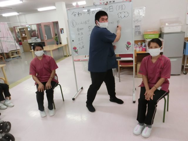 こちらはリハビリスタッフとの集団レクリエーションの風景です。言葉遊びや早口言葉を一緒にしました。