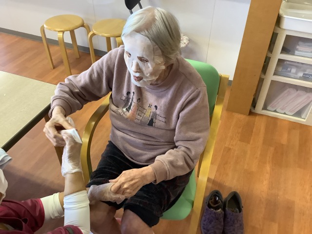 皆様に足浴を楽しんで頂き、手のマッサージをしました。また、顔パックも行いました。
