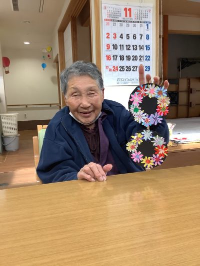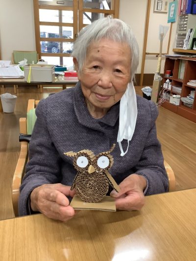 10月は段ボールでフクロウの作品、11月は菊の飾りの作品に取り組んで頂きました。