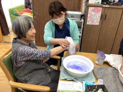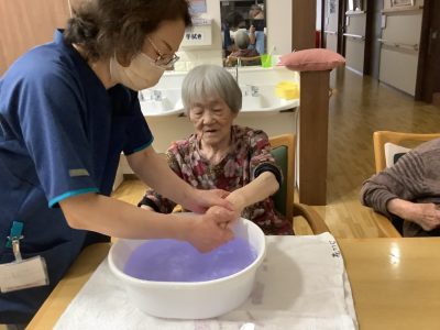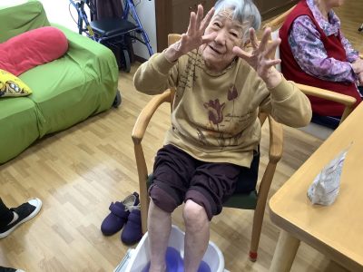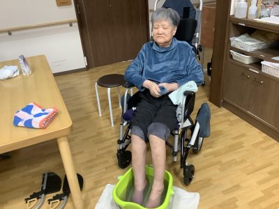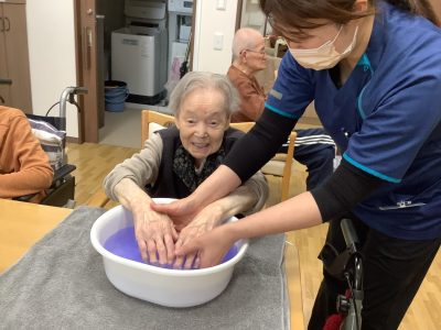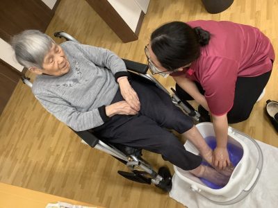 ラベンダーの入浴剤を準備し、足湯と足のマッサージを