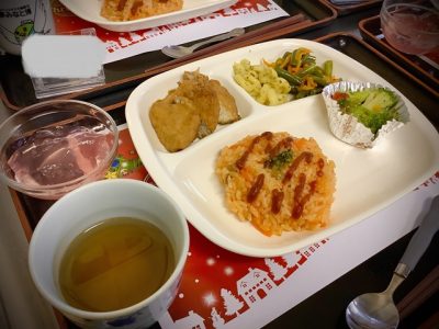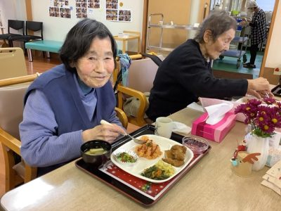 昼食はテーブルに作品作りで作ったサンタさんやトナカイなどを飾って、クリスマスメニューを楽しんで頂きました。