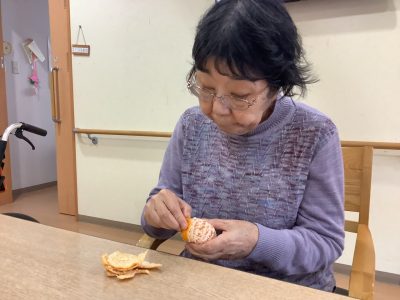 果物の皮をむいてもらいながら、