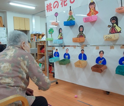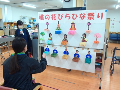 3月3日 おしどり荘通所リハビリで、桃の花びらひな祭り会を行いました。
