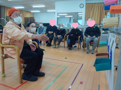 職員の顔のひな壇目掛けて玉を投げ入れて競って頂きました。